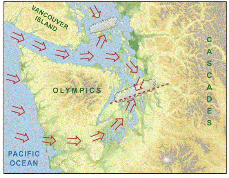 That’s partially because wind and weather coming in off the Pacific gets split north and south around the Olympic Mountains, trapped by the Cascade Range to the east, and are pushed back together—creating an ever-present, ever-changing convergent zone in Puget Sound. The result is all manner of regular, fickle wind and weather conditions.